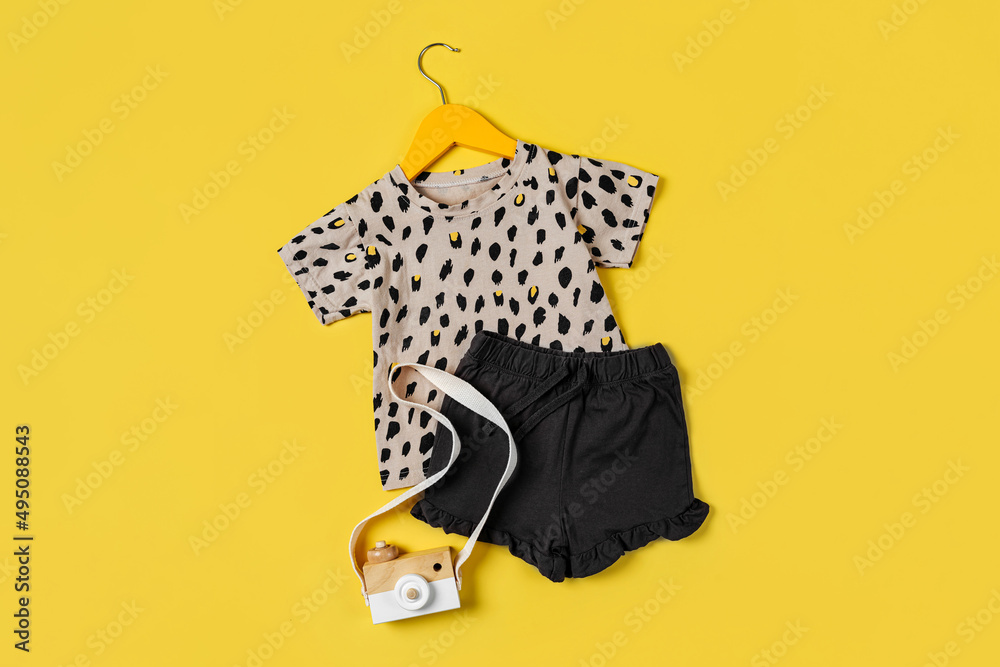 T-shirt with shorts. Baby clothes and accessories for spring, autumn or summer on yellow background. Fashion kids outfit. Flat lay, top view