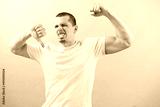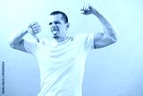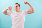 Muscular caucasian man in white t-shirt flexing biceps and thumbs down against blue background. Disappointed. Miserable. Suffering. Trouble. Confused. Troubled. Suffer. Confusion. Worry. Worried