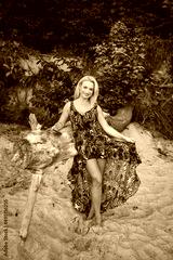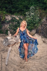 Female wild session in the bosom of nature. Beautiful woman in a dress on a sandy beach.