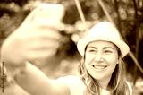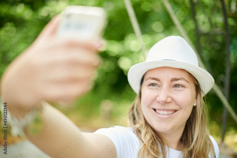 Young adult curvy blonde woman holds a mobile phone while takes a selfie smiling outdoors. Spring sunny day.