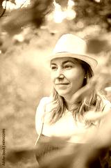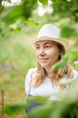 Young adult blonde curvy woman wearing a hat on a sunny summer day in the forest. Thinking natural pose outdoors.