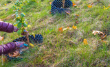 Close up view of woman's hands pruning raspberry bushes with garden shears. Sweden.