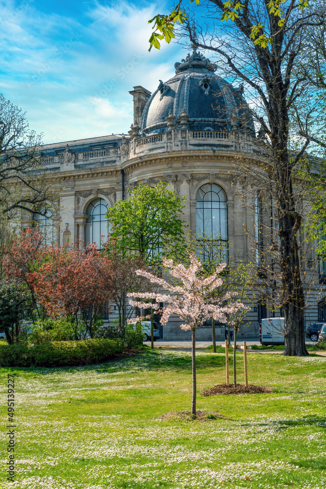 Rear View of the Petit Palais museum with Cherry tree with pink flowers in bloom in the foreground - Paris, France