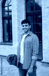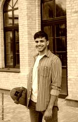Handsome smiling skater holding longboard looking at camera walking on the street