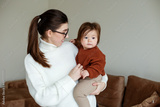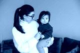 Young mother holds beautiful little daughter in arms. Babysitter plays with baby.