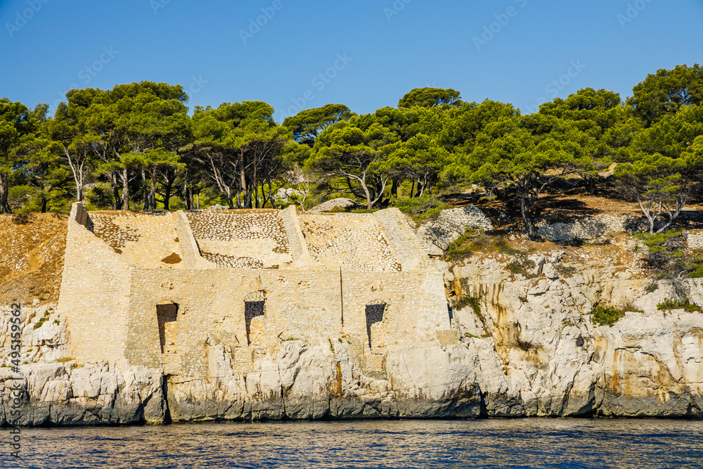 Coastline of the Calanque de Port-Miou and remains of old limestone quarries in Cassis Provence seen from an excursion boat cruising on the Mediterranean sea in France
