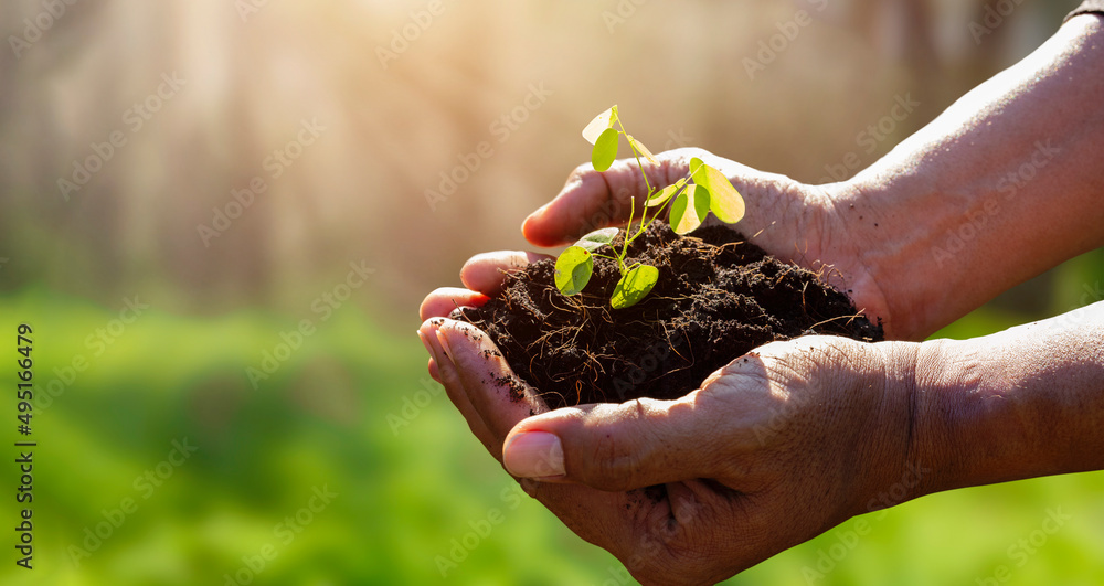 Man's hand holding young plant with sun rays on blur green nature background, concept eco earth day.