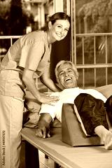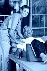 Mann bei Krankengymnastik neben Physiotherapeutin