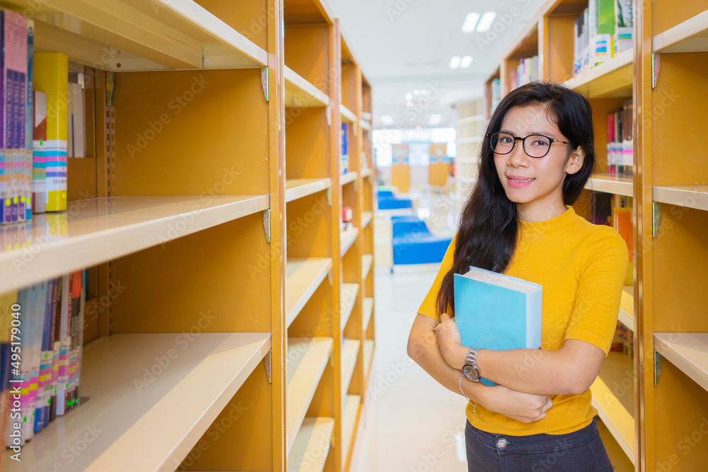 Female college student holding books in library