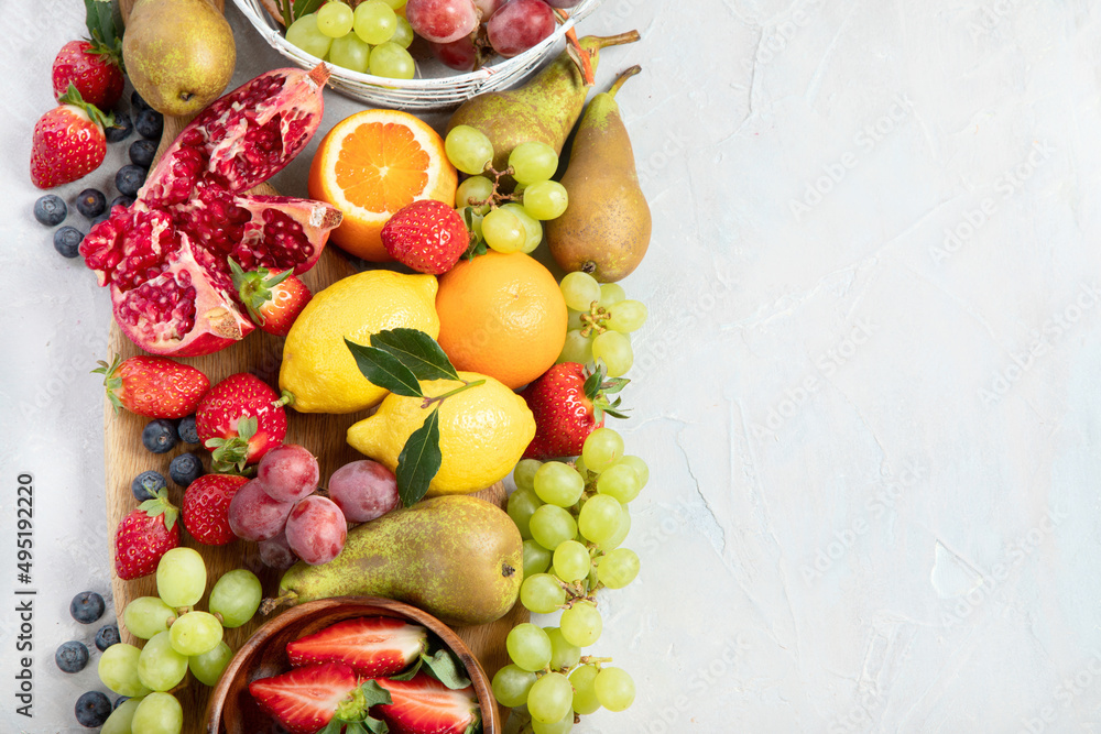 Assortment of colorful ripe tropical fruits on light gray background.
