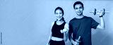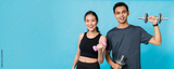 Asian beautiful happy woman holding dumbbell and standing with boyfriend are exercising isolated on blue color background.Concept of slim and healthy girl workout.