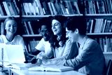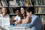 Laughing multi ethnic students use laptop studying or having fun using laptop sit at shared table in university library, having friendly relations, prepare for exams together using modern tech concept