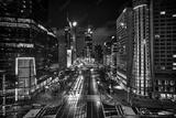 Beautiful panoramic aerial drone skyline view of the center of night Warsaw with skyscrapers in the background on avenues of John Paul II - the lights of the big city by night, Poland, EU