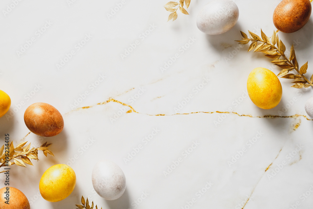 Elegant Easter background. Frame made of luxury Easter eggs and golden branches on marble table. Flat lay, top view, copy space.