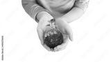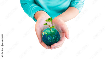 Hand hold plant on earth on white isolated background