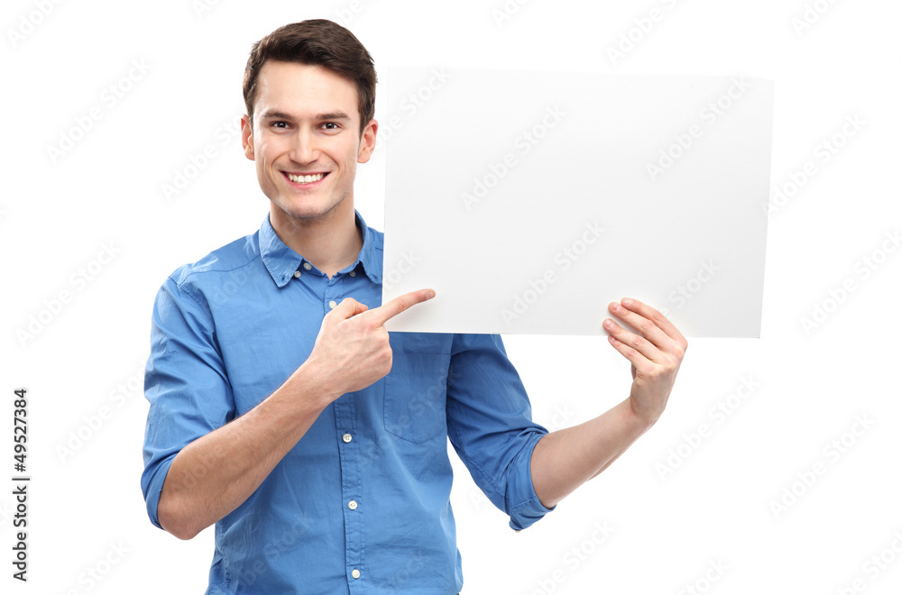 Man pointing at blank poster