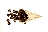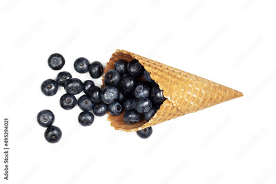 Fresh ripe blueberry in waffle cone. Ice cream cone with ripe sweet berries on white background with copy space. Summer creative concept, flat lay, Top view.