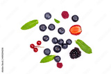 Ripe sweet berries and mint leaves on isolated white background. Flat lay, top view.