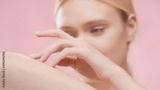 Young fit beautiful European blonde woman touches her forearm on pink background | Body care or unwanted hair removal commercial concept