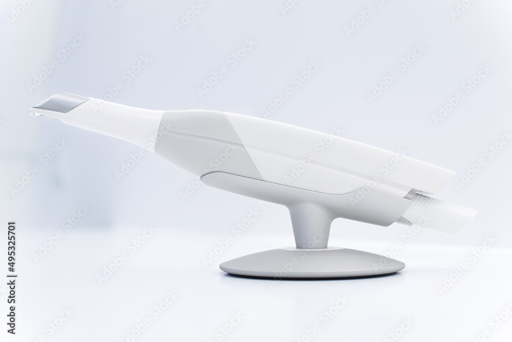 Dental intraoral scanner isolated on table in bright dentist office. Dentistry and health care concept. Close up.