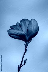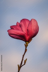 Close up of a pink flower. Beautiful magnolia with a blue sky background. Photo with shallow depth of field.