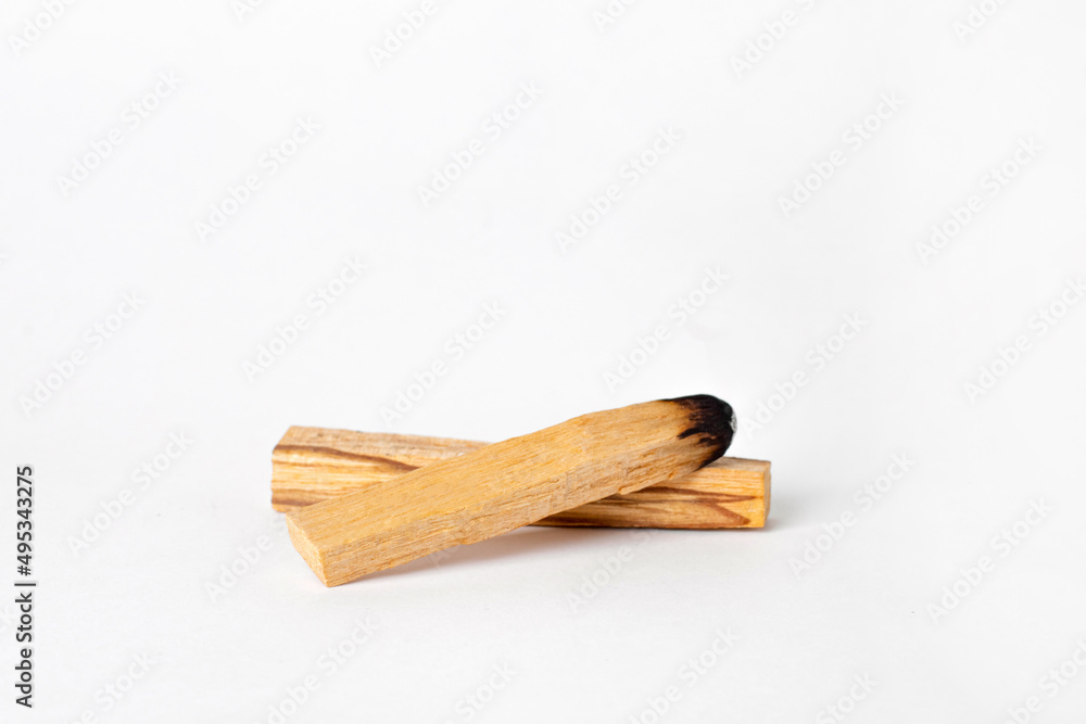 Palo Santo bars close-up and copy space. Ritual cleansing with sacred ibiocai, meditation, aromatherapy with incense and candles.