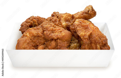 Fried chicken in paper bucket isolated on white background, Fried chicken on white With clipping path.