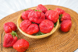 Red strawberries on wooden bowl in wooden background, Fresh Amaoh Strawberry on wooden plate background.