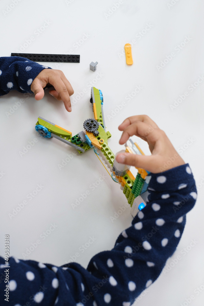 Coding Class, school girl constructing robot arm mechanism. multiethnic children making science, technology tasks with tablet. Modern education African American girl experimenting on lesson Close-up