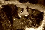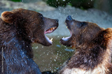 Two Wild Brown Bear fight on pond in the summer forest. Animal in natural habitat. Wildlife scene