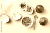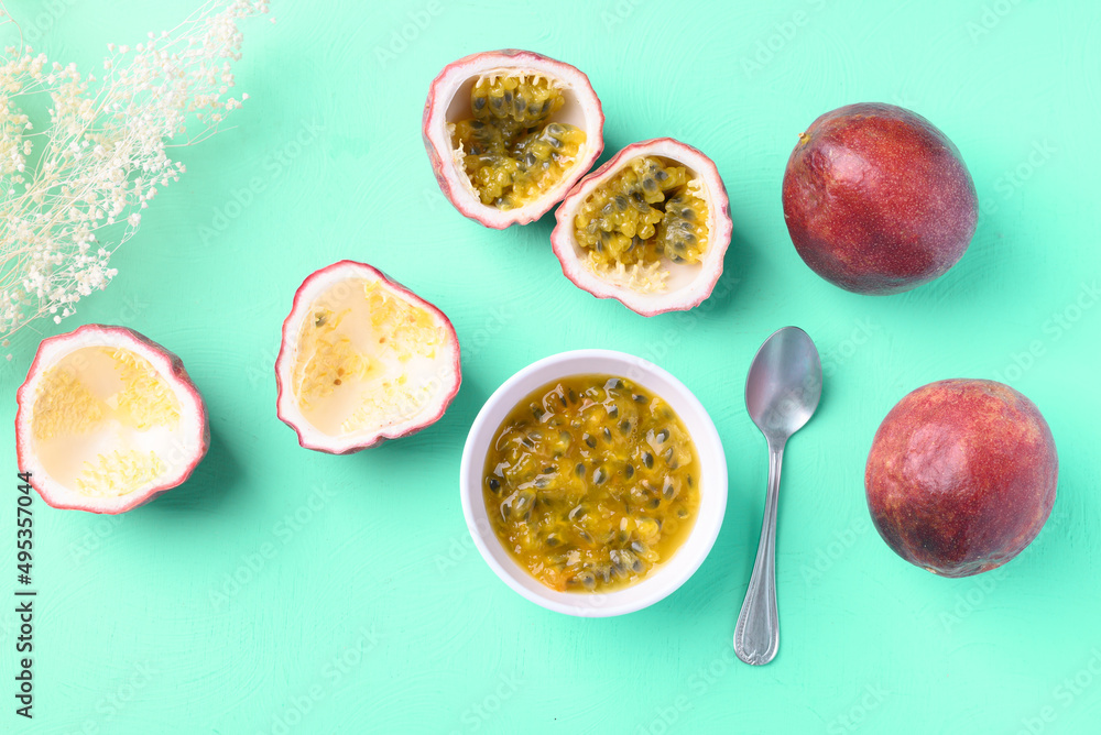 Passion fruit juice in bowl with spoon for eating on pastel color background, Tropical fruit in summer season