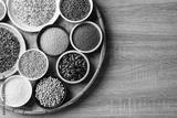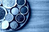 Various cereal, grain, bean, legume and seed in bowl on wooden background, Food ingredients, Table top view