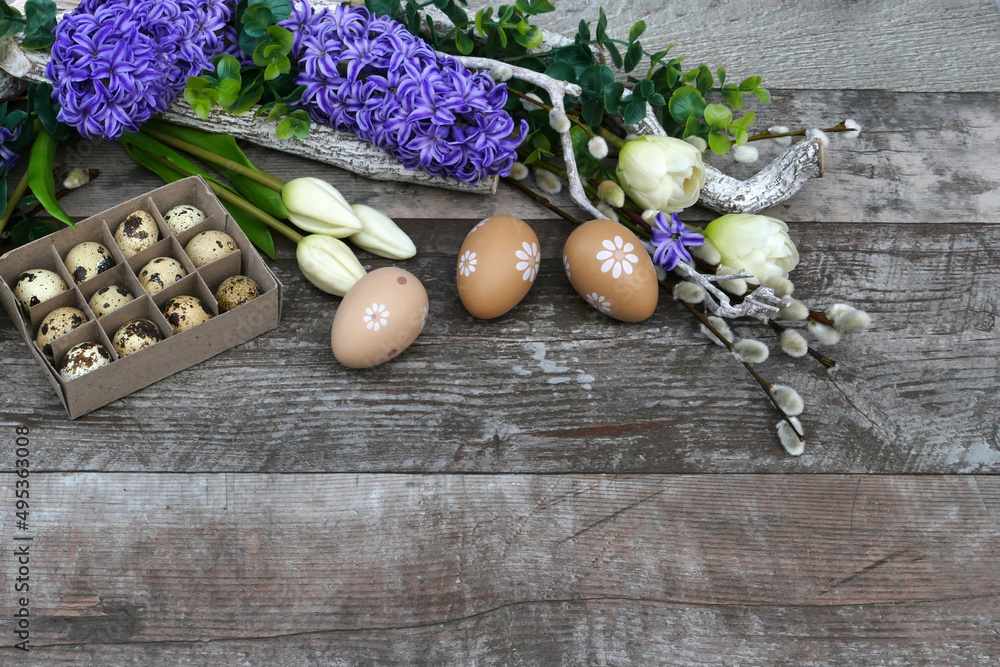 Osterarrangement mit Blumen, Ostereiern und Platz für Text.
