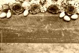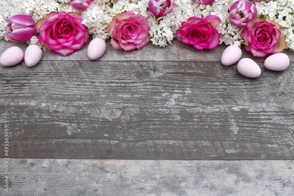 Osterhintergrund: Flieder und Rosenblüten mit Ostereiern auf Holzhintergrund.