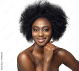 Happy African Beauty Model Face with Afro Hairstyle. Cheerful smiling Woman with Dark Skin and Black Curly Hair over isolated White. Women Cosmetic and Cosmetology Care