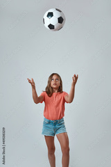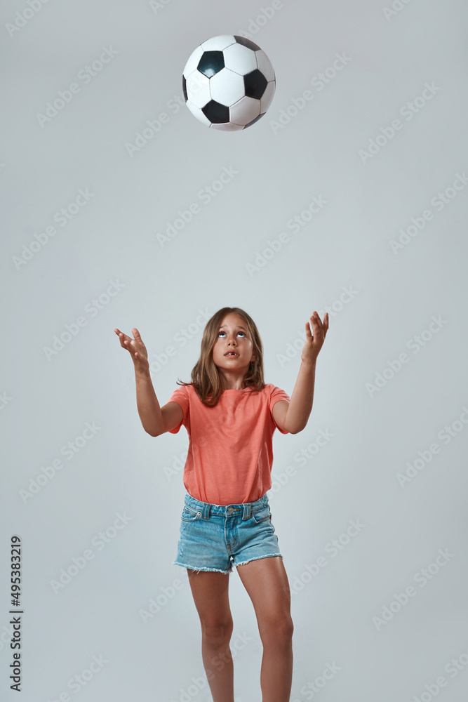 Front view of little girl throw up football ball