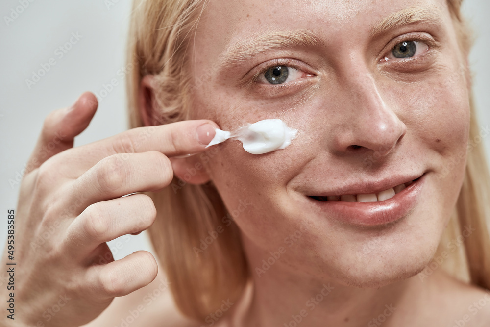 Man smearing cosmetic cream from container on face