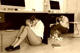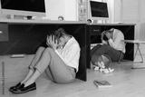 Scared employees hiding under office desks during earthquake