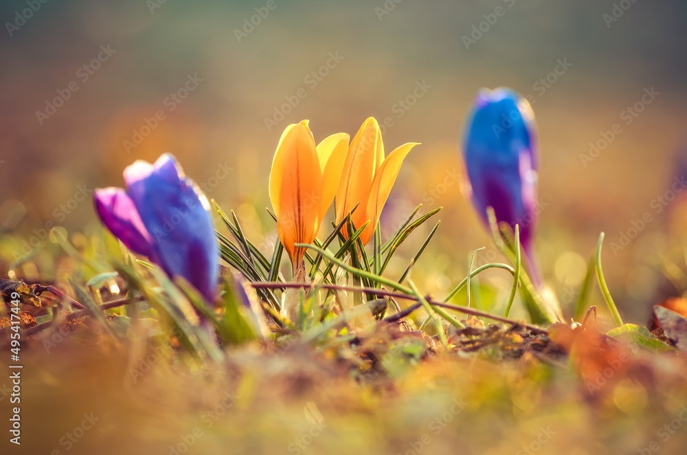 Colorful natural background with flowers. Beautiful crocuses on a green glade to welcome spring. Photo in shallow depth of field.