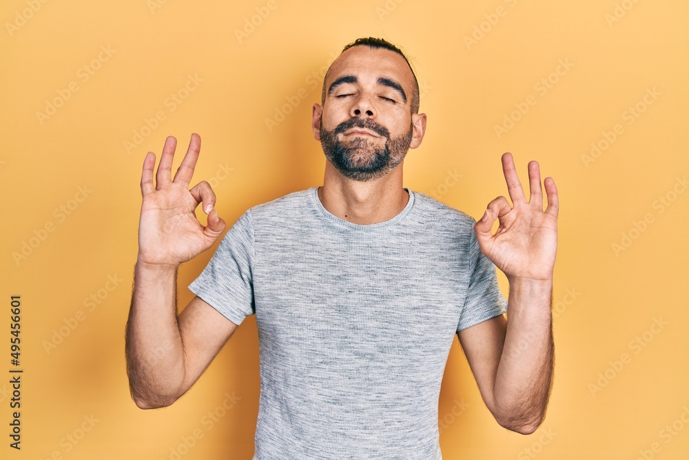 Young hispanic man wearing casual clothes relax and smiling with eyes closed doing meditation gesture with fingers. yoga concept.