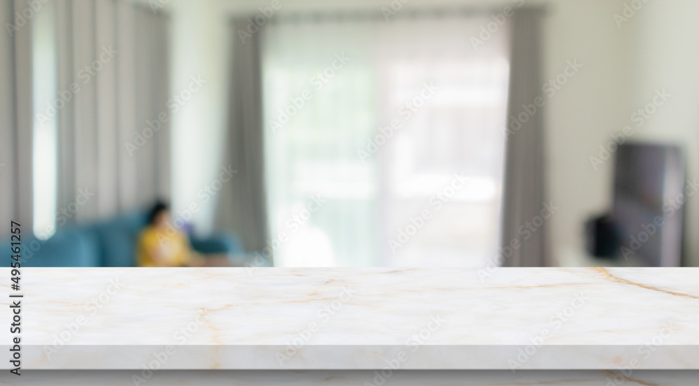 Empty marble table top with blur room interior with window curtain background