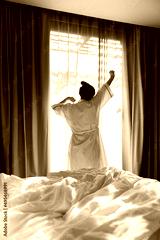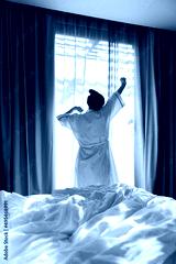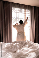 white dress asian female beautiful woman stretching morning wake up freshness and carefree weekend moment in cosy interior bedroom with white curtain and sun shine background lifestyle home concept