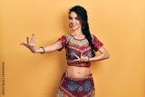 Young indian woman wearing traditional belly dancer costume. Dancing exotic oriental dance with body and hands