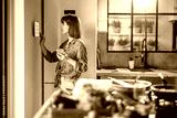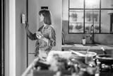 Woman using digital tablet hanging on the wall in the kitchen, controlling smart home devices. Modern kitchen interior with food in front