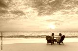 Senior couple enjoying beach vacation at sunset Bahamas