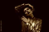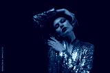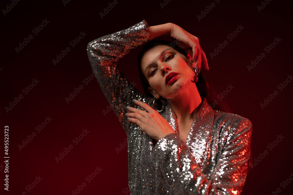 Fashionable beautiful confident woman with red lips makeup, wearing trendy sequin dress, posing in red light. Studio fashion portrait. Copy, empty space for text