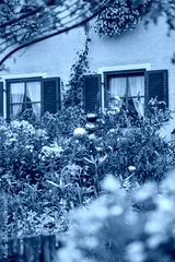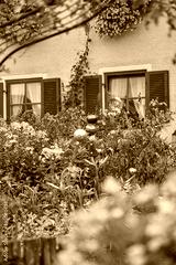 Beautifully maintained farmhouse garden with colorful flowers, in Bavaria, Southern Germany. Detail.