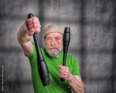 senior man (in late 60s) is exercising Indian clubs, portrait against dark grunge background, fitness over 60 concept