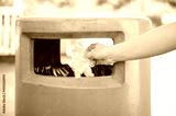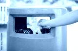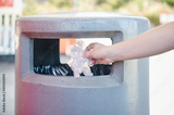 A woman's hand deposits a transparent plastic glove in the rubbish bin after having used it to refuel at a gas station.