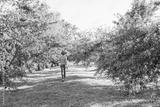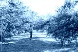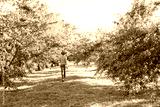 A cheerful kid in jeans, a T-shirt and a blue hat is playing in the garden among the apple trees.